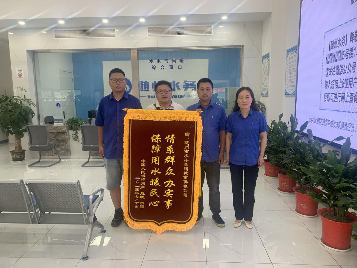 近日,中國人民銀行用戶將一面繡有“情系群眾辦實事  保障用水暖民心”的錦旗送到隨州市水務(wù)集團城市供水公司共享營業(yè)廳。感謝運維中心維修人員急用戶之所急、憂用戶之所憂、真心為用戶考慮,解決其用水問題。