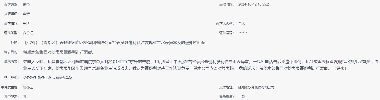 【保密】(曾都區(qū))表揚隨州市水務(wù)集團有限公司抄表員聶慢利及時發(fā)現(xiàn)業(yè)主水表異常及時通知的問題  |