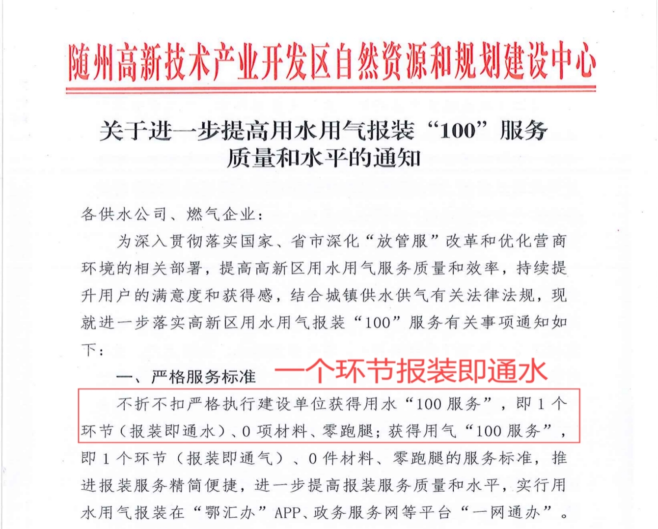 隨州市高新區(qū)出臺用水報裝相關文件              http://www.suizhougxq.gov.cn/ztzl/yhyshj/zcwj_ys/202408/t20240829_1249131.shtml              隨州水務集團制發(fā)用水報裝“四零”方案              http://www.suizhou.gov.cn/ggqsydwxxgk/sdq/qy/szsswjt/gzzd/202308/t20230804_1131127.shtml               |