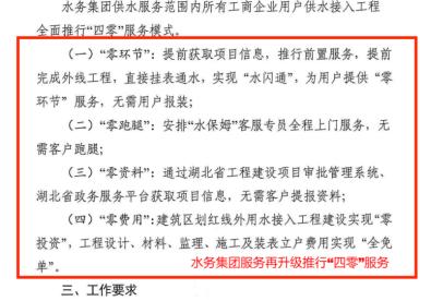 1.“零環(huán)節(jié)”:客戶需要用水時,即時通水;              2.“零跑腿”:安排“客服專員”全程上門服務,無需客戶跑腿;              3.“零資料”:通過湖北省工程建設審批系統(tǒng)、湖北省政務服務平臺獲取項目信息,無需客戶提報資料;              4.“零費用”:針對企業(yè)用戶供水接入項目,工程設計、材料、監(jiān)理、施工全部免費。               |