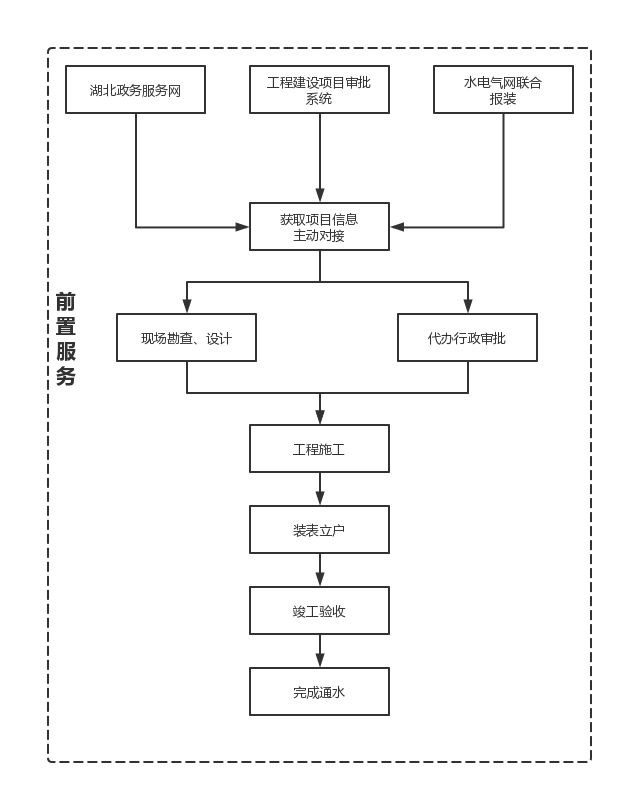 (一)通過(guò)政企數(shù)據(jù)共享及通過(guò)湖北省工程建設(shè)審批系統(tǒng)、湖北政務(wù)服務(wù)網(wǎng)等渠道,獲取用戶(hù)信息,主動(dòng)對(duì)接,主動(dòng)掌握用戶(hù)用水需求,根據(jù)接入地點(diǎn)的不同和用戶(hù)需求,確定是否需要在地塊紅線外增設(shè)接入管線,并將后續(xù)相關(guān)事項(xiàng)告知用戶(hù)。